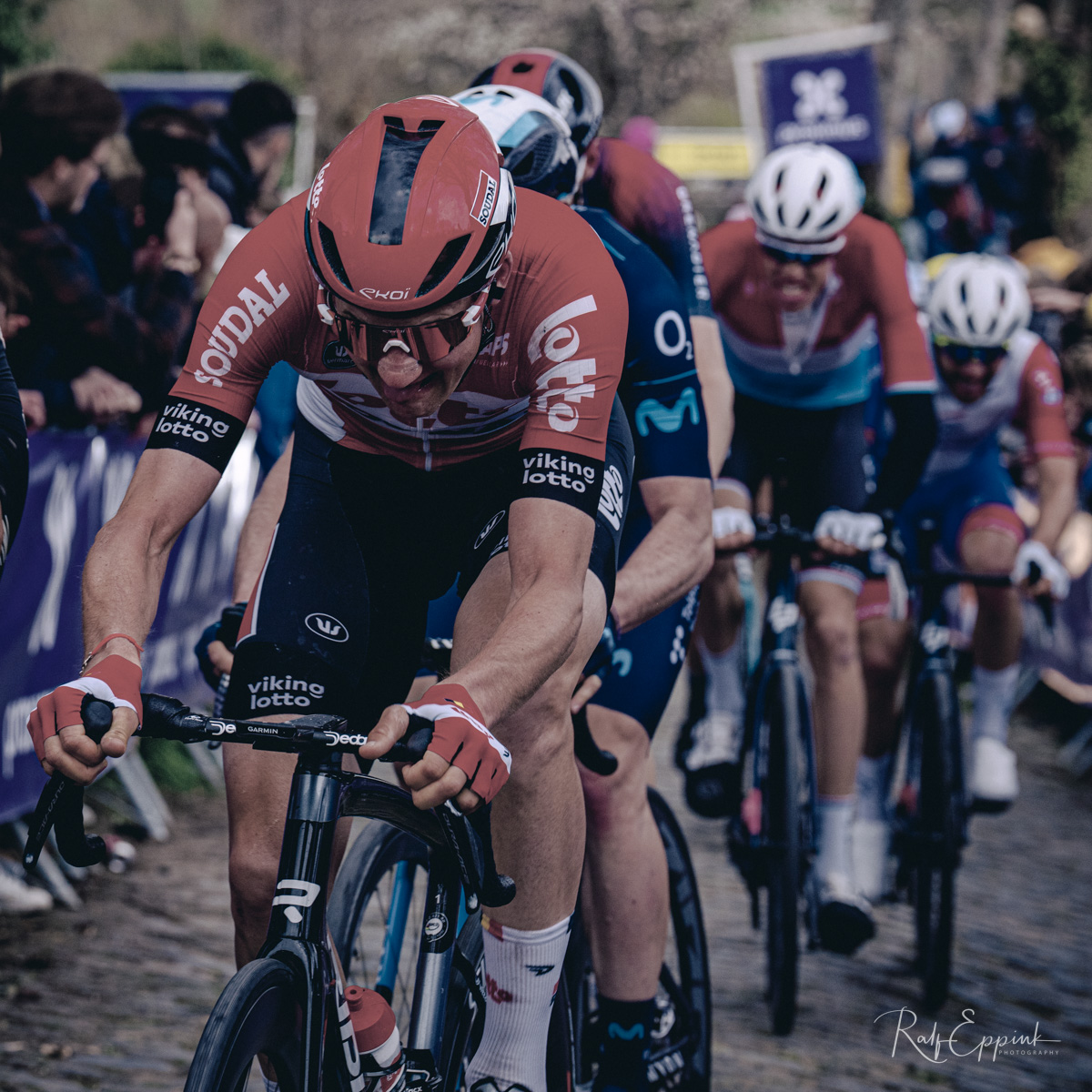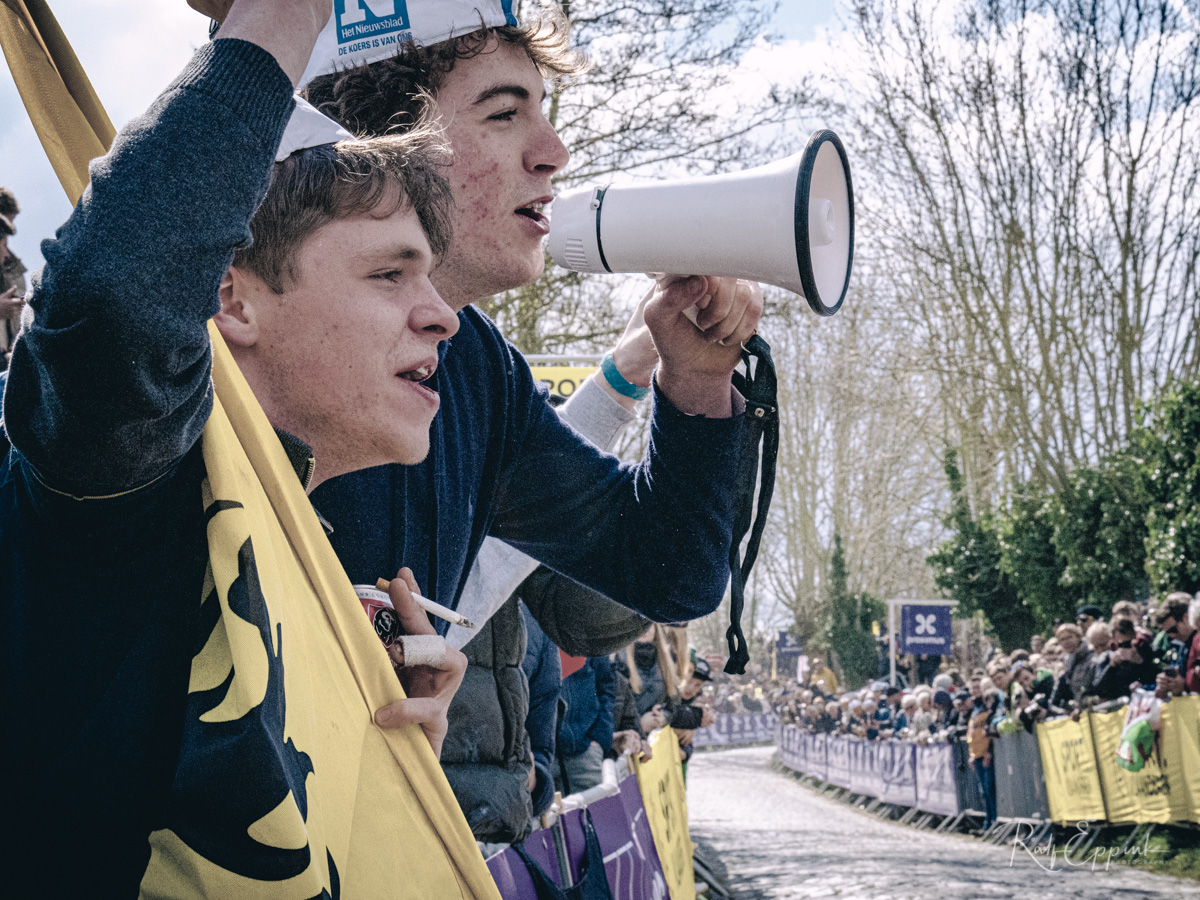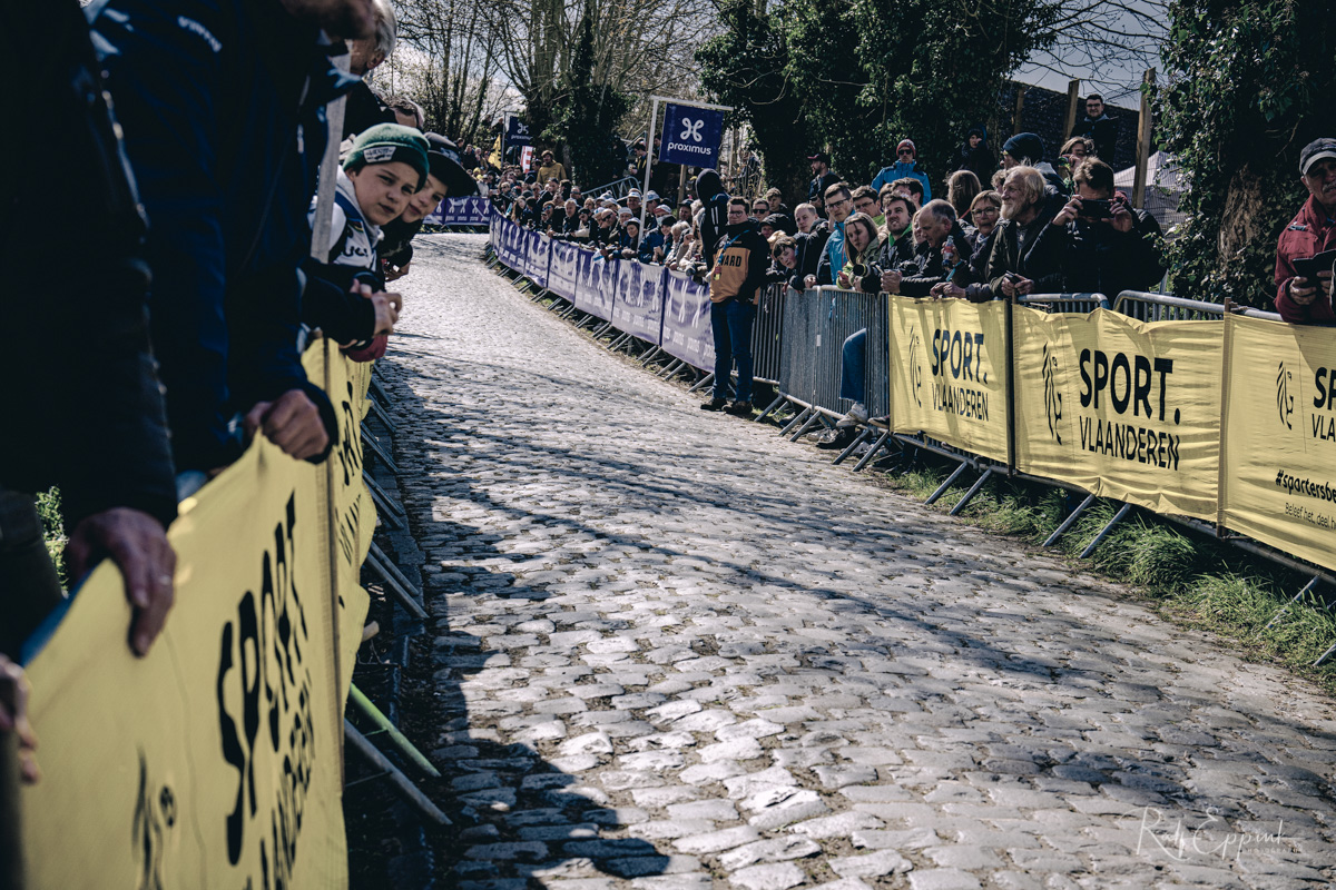 Beim Profirennen stand ich dann tags darauf für meine Fotos am Oude Kwaremont, einer der Renn-entscheidenden Kopfsteinpflaster Anstiege. Seit einigen Jahren wird dieser 2 km lange Hügel mehrfach durch-/überfahren und bildet mit dem Paterberg kurz vor dem Ziel einen Rennabschnitt, an dem nicht selten die Vorentscheidung fällt, wer hier vorne mit fährt hat Chancen auf das Podium wenn nicht gar auf den Sieg.