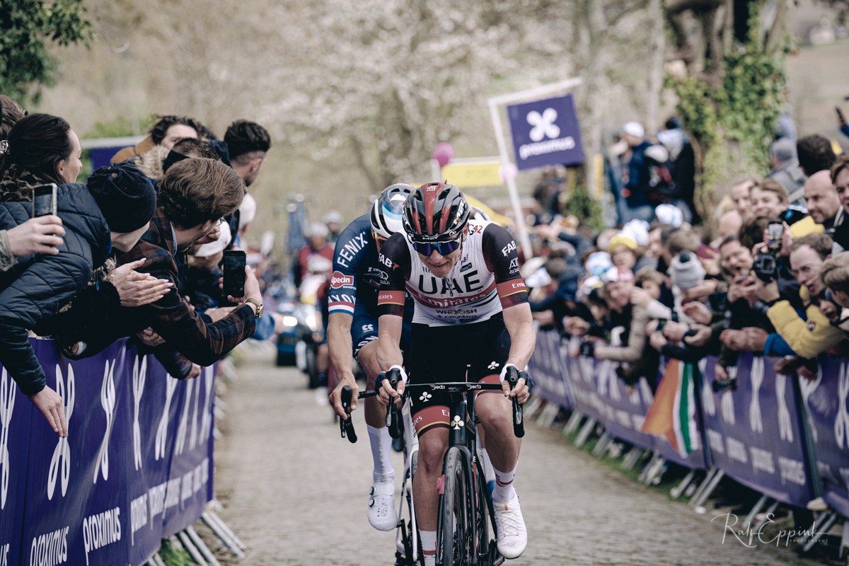 Im letzten Durchgang ging es dann schlag auf Schlag, Tadej Pogacar – hier noch führen – mit seinem Schatten Mathieu Van Der Poel und knapp eine Minute dahinter erst das Feld.